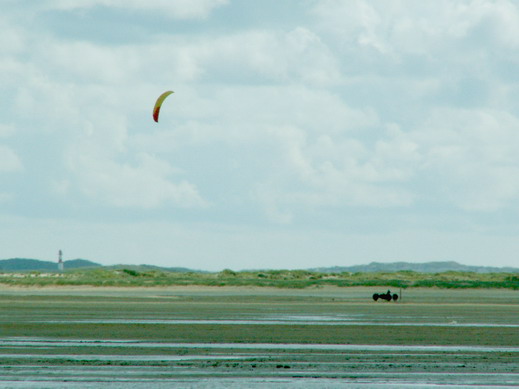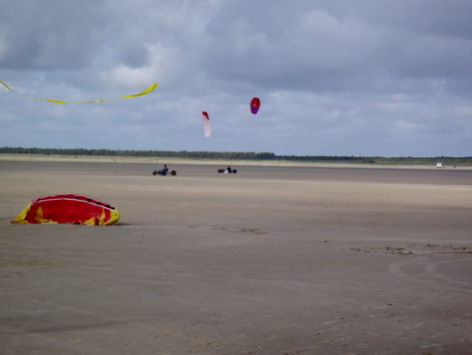 Samozřejmě po asi 2 hodinách převalování kdy jsem prostě nespal jsme to už nevydrželi a prostě vše zabalili, přešoupli Katku do auta a kolem 22 jsme vyráželi z domova. Holky, místo aby chrněly, tak měly oči jako brambory. Až kus před Lipskem konečně usnuly. Cesta byla ok, jen chvílema neskutečnej slejvák. Až na jedinou zácpu proběhlo vše v pořádku, a tak jsme se kolem 10 ráno již mohli kochat mořem na silnici, mezi ostrovem ROMO a pevninou. Za 20 minutek jsme dorazili k domečku, najedli se a jeli okouknout kitearénu. Její rozloha nás naprosto ohromila a to byla z půlky pod vodou!!! Se strachem - poprvé jedu na pláži - jsme vjeli na písek.....Vítr kolem 10-11m/s mě dost odrazoval a na písku jsem se na začátku bál. když jsem měl skoro vybaleno, přijel Tomáš s Mirkou a začlo se jezdit.